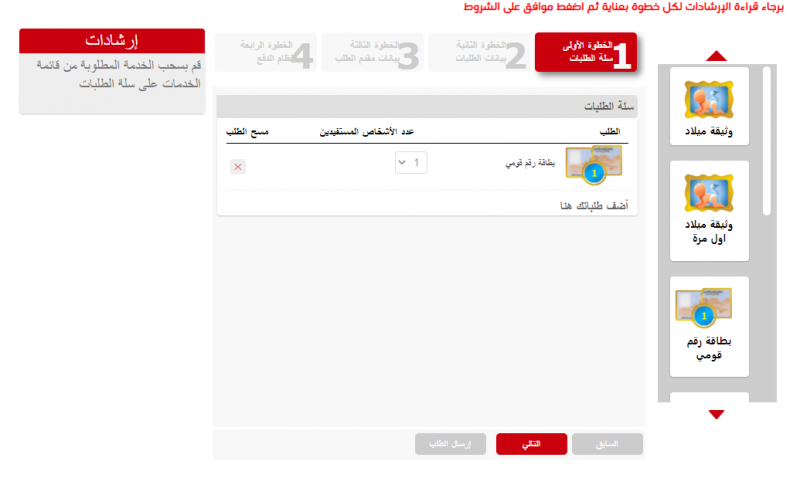 ويدخل مقدم الطلب بيانات الوثيقة المطلوبة، وهي الاسم، واسم الأم، ونوع الوظيفة، والوظيفة، والرقم القومي؛ ثم إدخال بيانات مقدم الطلب، ونظام الدفع، وإتمام الطلب، ليتحدد بعدها موعد ومكان الاستلام.