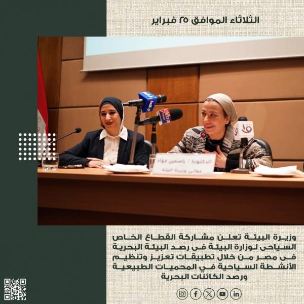- وزيرة البيئة تعلن مشاركة القطاع الخاص السياحى لوزارة البيئة فى رصد البيئة البحرية فى مصر من خلال تطبيقات تعزيز وتنظيم الأنشطة السياحية في المحميات الطبيعية ورصد الكائنات البحرية .