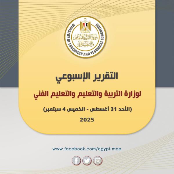 أصدر المركز الإعلامي لوزارة التربية والتعليم والتعليم الفني التقرير الأسبوعي للوزارة خلال الفترة من (الأحد ٣١ أغسطس - الخميس ٤ سبتمبر ٢٠٢٥) ويتضمن ما يلى :
