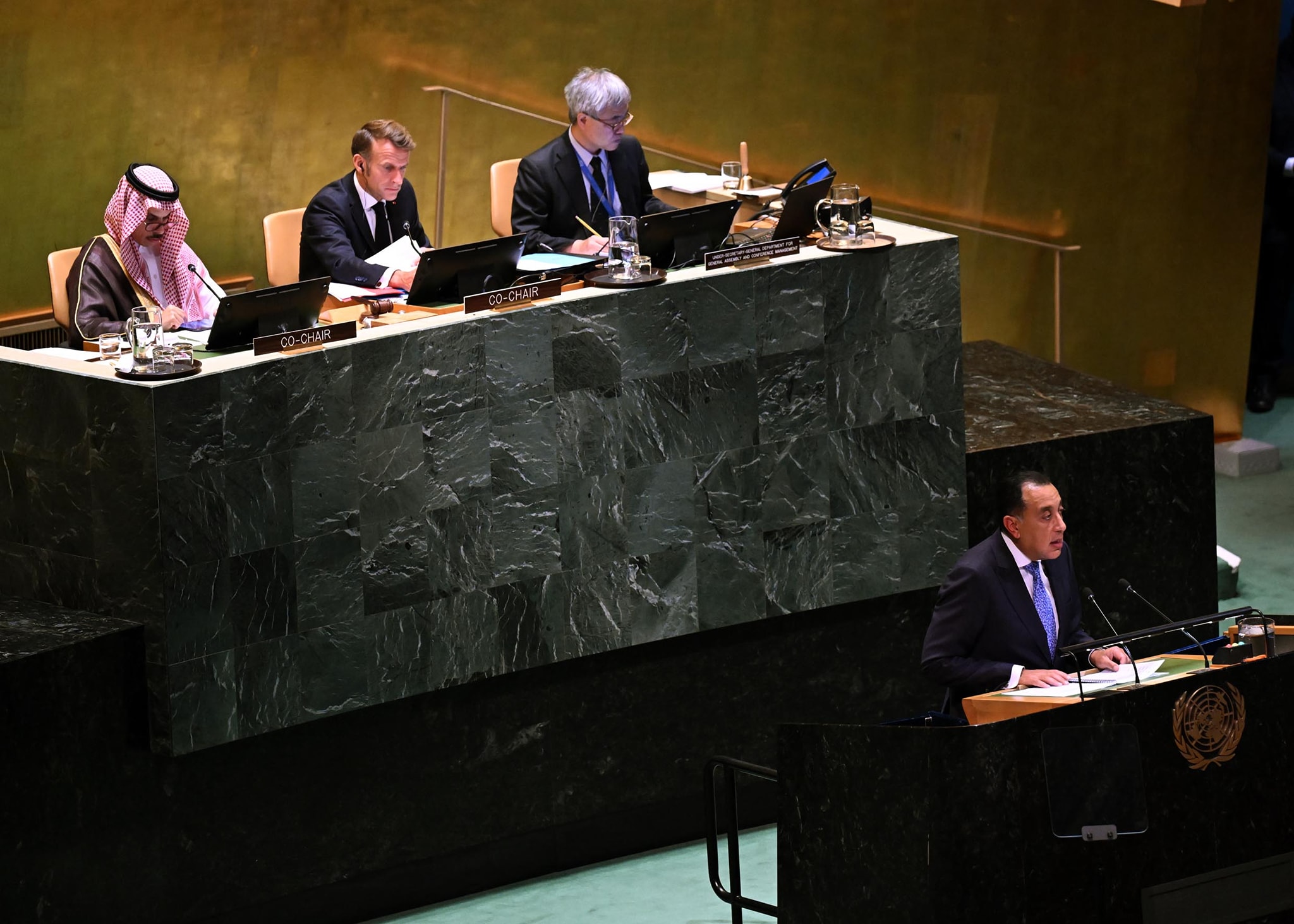 ألقى الدكتور مصطفى مدبولي، رئيس مجلس الوزراء، نيابة عن فخامة السيد الرئيس عبدالفتاح السيسي، رئيس الجمهورية، اليوم، كلمة مصر في المؤتمر الدولي رفيع المستوي «من أجل التسوية السلمية لقضية فلسطين وتنفيذ حل الدولتين»، بقاعة الجمعية العامة للأمم المتحدة، ضمن أعمال الأسبوع رفيع المستوى لاجتماعات الجمعية العامة للأمم المتحدة في الدورة الـ 80، وذلك بحضور كل من الدكتور/ بدر عبدالعاطي، وزير الخارجية والهجرة وشئون المصريين بالخارج، والسفير/ أسامة عبدالخالق، مندوب مصر الدائم لدى الأمم المتحدة في نيويورك.