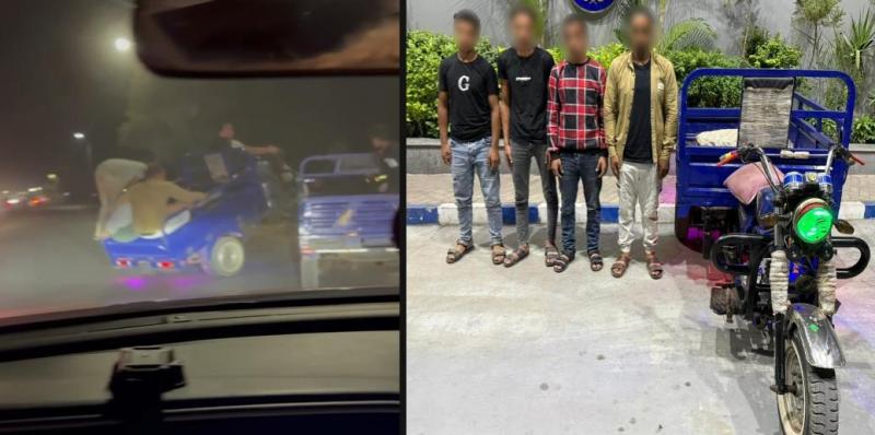بالفحص أمكن تحديد وضبط مركبة الـ"تروسيكل" الظاهرة بمقطع الفيديو (بدون لوحات معدنية) وقائدها ومستقليها وقت ارتكاب الواقعة (4 عمال- مقيمين بدائرة مركز شرطة فاقوس بالشرقية).