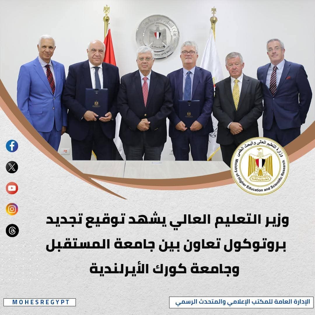 شهد الدكتور أيمن عاشور وزير التعليم العالي والبحث العلمي، توقيع تجديد بروتوكول تعاون بين جامعة المستقبل وجامعة كورك الأيرلندية، وبموجب بروتوكول التعاون، سيتم استمرار منح درجات علمية مزدوجة لطلاب كلية الصيدلة بمرحلتي البكالوريوس والدراسات العليا، بالإضافة إلى تكثيف برامج التبادل الطلابي وأعضاء هيئة التدريس، وزيادة التبادل العلمي، فضلًا عن تعزيز التعاون المشترك في المجالات الأكاديمية والعلمية والبحثية بين الجامعتين، وأشار الوزير إلى الرؤية الشاملة للدولة بأن تكون مصر منصة تعليمية جاذبة، ووجهة للراغبين في الحصول على خدمات تعليمية متميزة في المنطقة العربية والقارة الإفريقية والشرق الأوسط.