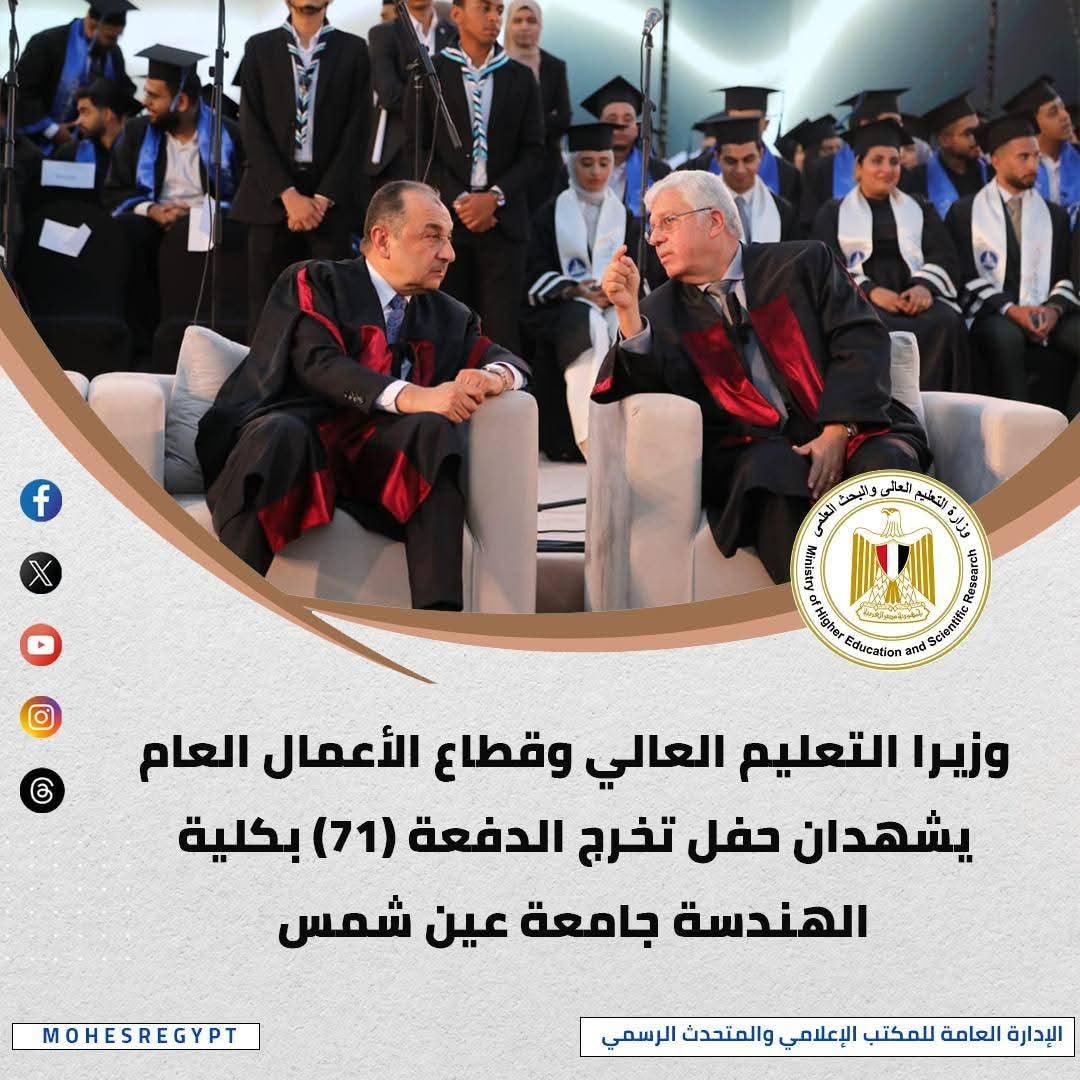 شهد الدكتور أيمن عاشور وزير التعليم العالي والبحث العلمي، والمهندس محمد شيمي وزير قطاع الأعمال العام، فعاليات حفل تخرج الدفعة (71) لطلاب كلية الهندسة بجامعة عين شمس، وأكد الدكتور أيمن عاشور سعادته بالمشاركة في هذه الاحتفالية المتميزة، موجهًا التهنئة للخريجين وأولياء أمورهم الذين كان لهم الدور الأكبر في دعم أبنائهم حتى بلوغ هذه المرحلة المهمة، معربًا عن فخره بانتمائه لكلية الهندسة بجامعة عين شمس، داعيًا الخريجين إلى الاعتزاز بهذا الصرح العريق الذي قدم لمصر والوطن العربي العديد من الشخصيات البارزة التي شغلت مناصب وزارية، وأسهمت في مسيرة التنمية، موضحًا أن الكلية خرجت 22 مهندسًا تقلدوا منصب وزير، واثنين من رؤساء الوزراء، إلى جانب نماذج ناجحة مثل المهندس هاني عازر، مشيرًا إلى الفترة التي تولى خلالها عمادة الكلية، والتي يعتز بها، حيث شهدت وضع مسودة الإستراتيجية الوطنية للتعليم العالي والبحث العلمي التي تم إعلانها عام 2023.