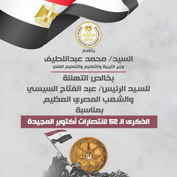 تقدم الوزير محمد عبد اللطيف وزير التربية والتعليم والتعليم الفني بالنيابة عن جميع العاملين بالوزارة بأسمى آيات التهاني والتقدير إلى السيد الرئيس عبد الفتاح السيسي، رئيس الجمهورية، القائد الأعلى للقوات المسلحة، وإلى الشعب المصري العظيم، بمناسبة الذكرى الثانية والخمسين لانتصارات أكتوبر المجيدة، التي ستظل رمزًا للفخر والعزة والبطولة في وجدان الأمة المصرية وتجسد أعظم معاني التضحية والوطنية والانتماء.